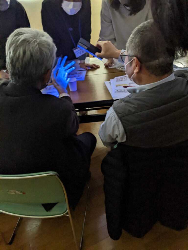 続く実技訓練では、手洗いチェッカーを用いて洗い残し箇所を視覚的に確認したり、手袋と N95 マスクの着脱から処分までの手順の練習も行いました。