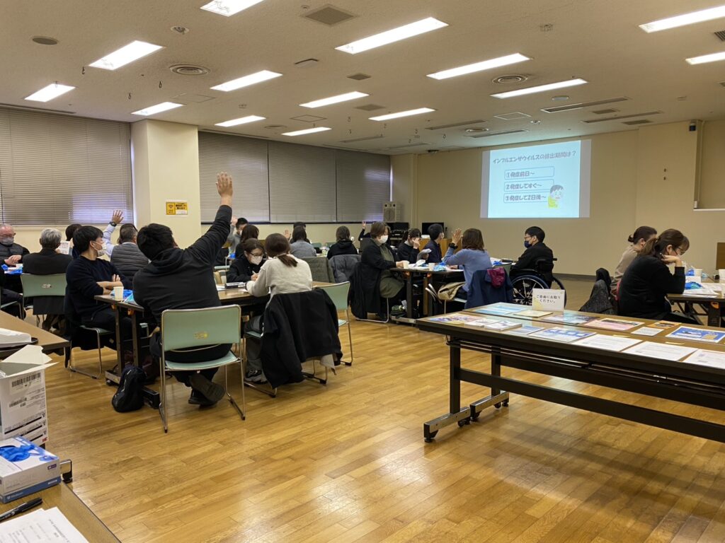 講話では、感染症の基礎知識に加え、嘔吐物等の適切な処理方法として次亜塩素酸ナトリウムの作り方など、自宅等訪問の際、突発的な状況でも対処できる実践的な内容をご指導いただきました。また歌に合わせて手洗い方法を学んだり、感染症についてのクイズもありました。